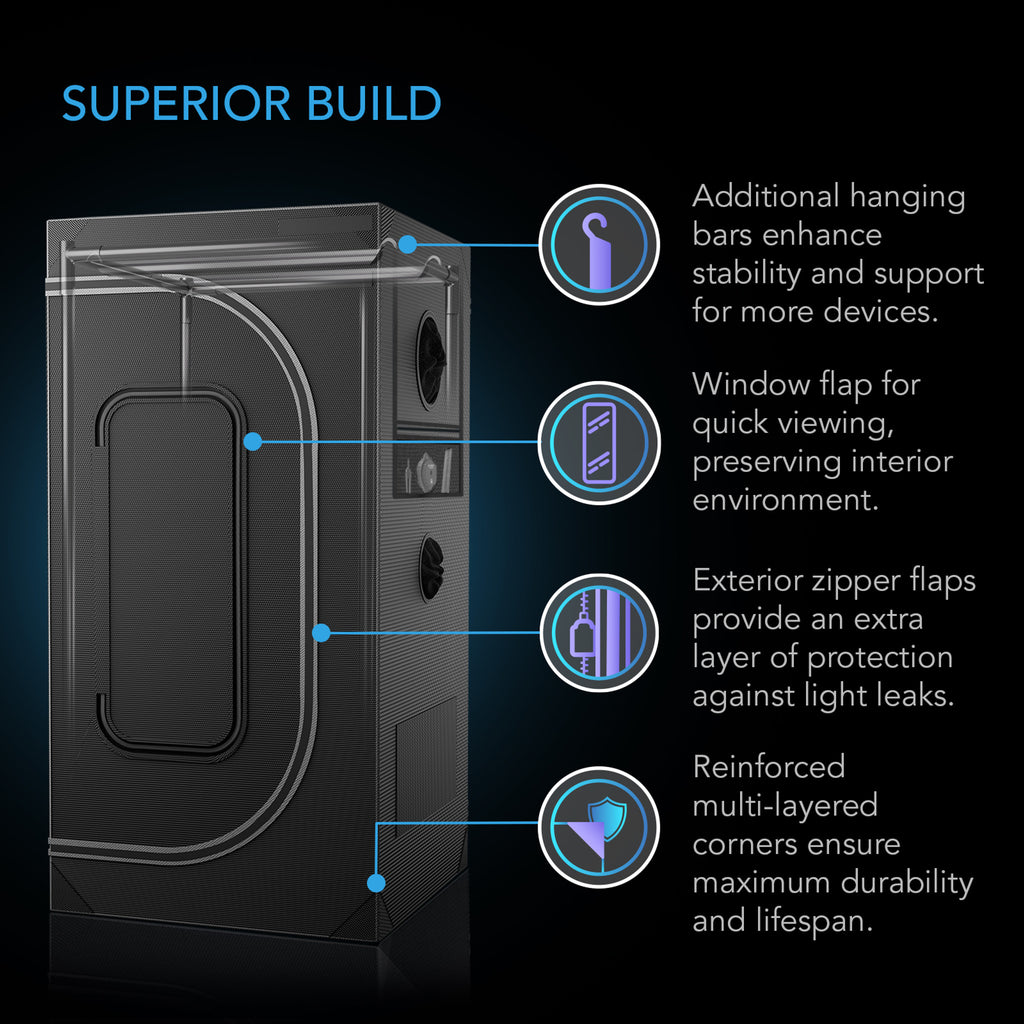Un système de tente de culture avancé avec des commandes intelligentes pour gérer votre environnement de culture et garantir des conditions de croissance idéales pour une récolte réussie. Le ventilateur en ligne, le filtre à charbon et les conduits gèrent les conditions climatiques de votre tente en évacuant la chaleur, l'humidité et les odeurs. L'air circule à l'intérieur grâce au ventilateur oscillant à pince pour fournir une légère brise à vos plantes. Les diodes LM301H EVO disposées de manière algorithmique sur le cadre d'éclairage de culture émettent un éclairage LED puissant sur une large couverture pour simuler la lumière naturelle du soleil et optimiser la croissance. Ces LED Samsung sont les meilleures de leur catégorie, offrant une intensité lumineuse plus élevée et une plus grande efficacité par diode que les LM301H, LM301B, Bridgelux 3030 et d'autres LED populaires. Les appareils sont logés dans une tente de culture Oxford haute densité, dotée d'un cadre en acier robuste et de parois en Mylar pour créer un espace de culture à température contrôlée.