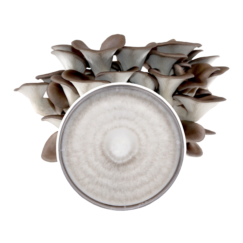 Blue Oyster mushrooms are known for their grey-blue caps, which fade to a soft grey as they mature. The caps are broad and convex, often developing a slightly wavy edge. These mushrooms grow well on sterilized hardwood substrates, typically forming thick, layered clusters. They exhibit vigorous growth and robust mycelium that spreads quickly through the substrate. Blue Oyster cultivation is suitable for all experience levels. However, using a plate culture requires a still-air box or laminar flow hood for best results, making it ideal for growers looking to refine and improve their skills.