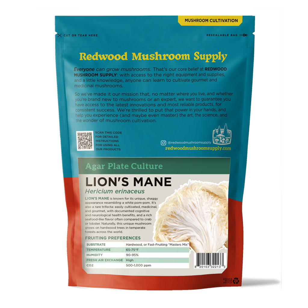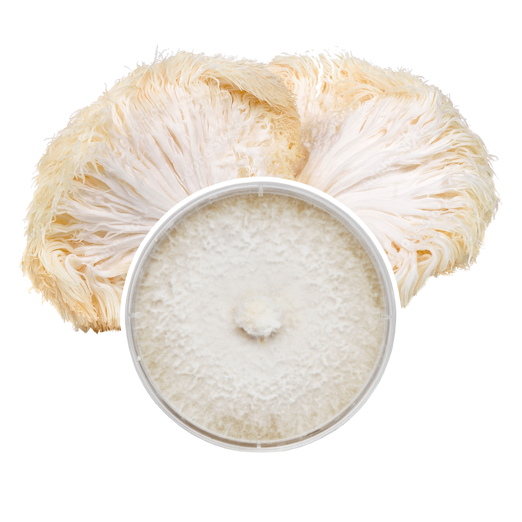 Lion's Mane mushrooms are recognized for their unique pom-pom-like fruit bodies and notable medicinal value. This hardy, commercially viable strain grows well on sterilized hardwood substrates, forming dense clusters. It is a fast-fruiter and heavy-yielder, suitable for all skill levels. Lion's Mane cultivation with plate culture requires a still-air box or laminar flow hood for best results, making it ideal for growers looking to refine and improve their skills.